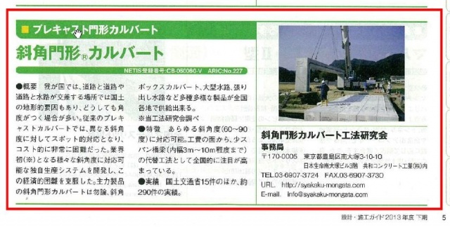 H26.1.27号の日経コンストラクション、「設計・施工ガイド」に斜角門形カルバートの広告を掲載致しました。