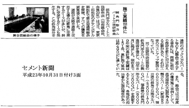 第9回通常総会の開催 平成23年10月19日、東京浜松町のチサンホテル浜松町にて、第9回通常総会を開催、すべての議案が原案通り可決されました。 また、セメント新聞第2987号(平成23年10月31日発刊)には、総会の模様が記事として掲載されました。